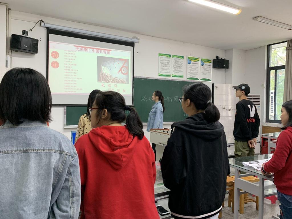 活动当天,同学们首先合唱团歌——《光荣啊,中国共青团》,随后在团支书的组织下,“年代秀”便正式开始了。第一环节,全班分为七组,每组代表新中国建立以来的不同年代。每组同学隐瞒自己所在年代上台展示自己准备的歌曲、物件、事迹等,让同学们通过观察与对祖国的了解猜出该组所处时代。有的同学以第一人称的方式描述了在那个年代的所见所闻,让同学们深觉搞笑又身临其境;有的同学展示并介绍了那个年代的老物件,让了解的人怀念又让不了解的人好奇不已;还有的同学播放了经典老歌,甚至如今还耳熟能详,脱口而出;还有吟诗、作画、表演等各种花样百出的方式,仿佛令同学们飞速经历了祖国七十年来的沧桑历程,但沉迷其中的同时也不忘主要任务,很快抓住关键点开始抢答,答对的小组便得到了一朵小红花。第二环节,PPT展示出建国七十年以来的大事件相关题目,同样以抢答的方式,答对的个人代表小组,奖励一朵小蓝花。每题以后的事件介绍让同学们对祖国发展有了更加深刻的了解。第三环节便是让同学们自由地畅谈感想,有的表达了对祖国的热爱与感激;有的认为此次活动受益匪浅;有的提出了对祖国未来的展望……