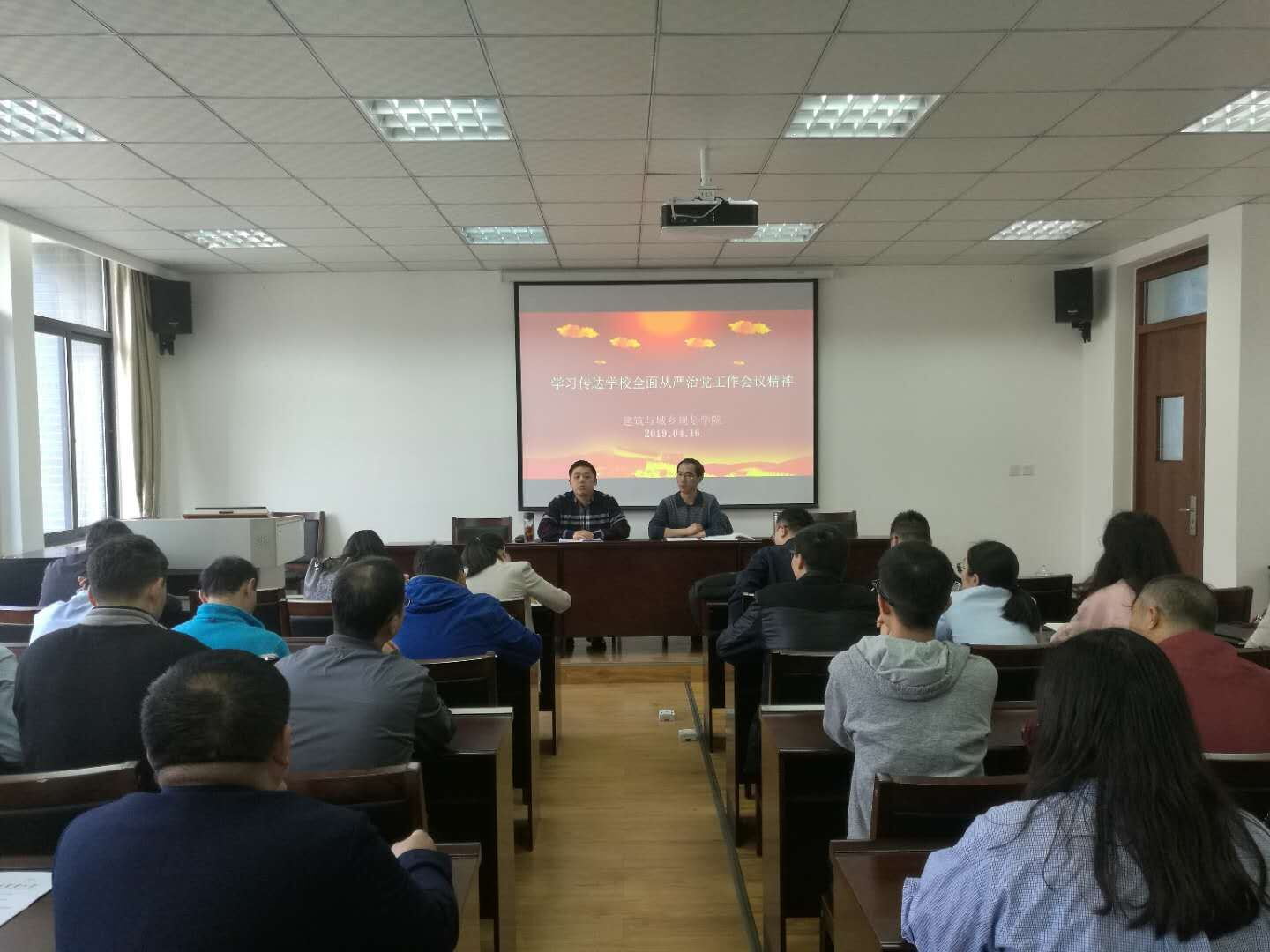 在2C405召开全体党员干部及教职工大会,学习传达学校全面从严治党工作会议精神。