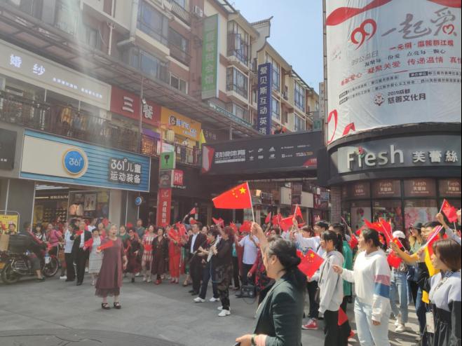 2019年9月25日下午一点,由四川天和盛世旅游资源开发有限公司主办,都江堰市柳河社区、川农大建爱团队协办的“迎国庆—《我和我的祖国》快闪拍摄活动”在天和盛世进行拍摄。天和盛世全体员工、都江堰柳河社区志工、四川农业大学建爱团队志愿者、部分商家参与了本次活动的拍摄。