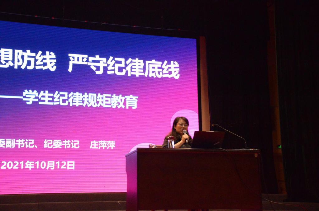 发生的一起违纪事件引入。她讲到,今年恰逢建党百年的特殊时期,谈到“中国共产党为什么能”与中国共产党的铁的纪律是分不开的。她提到,大学生作为国家培养的重要群体,重要代表必须时刻树立纪律规矩意识,模范遵守国家法律法规、校规校纪。庄老师通过在校生违纪的鲜活事例使我们看到了青年人陷入误区的种种情况,如疫情中 “挺而走险”的反例;寝室违规用电引发火灾造成的损失;由于学术诚信失去推免、评优的机会等案例,她严肃告诫同学们必须严格遵守规定,并要求大学生要有大局观,增强“四个意识”、坚定“四个自信”、做到“两个维护”,在日常学习和生活中绝不触碰红线、底线。