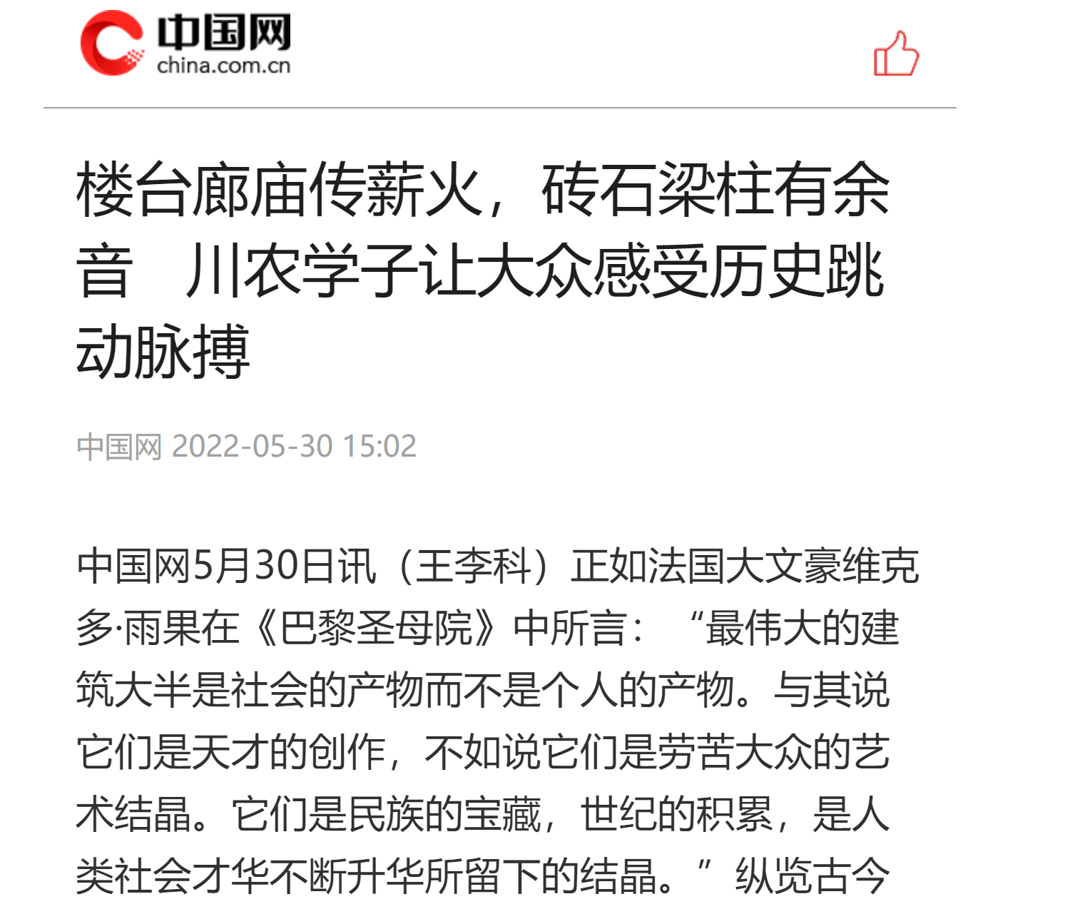 师生通过建立古建筑志愿服务队,联合当地政府相关单位共同开展有关保护都江堰古建筑的志愿活动,让一个个古建筑在经过修复后重新焕发出生机,为历史文化的传承和保护积薪堆火,垂范久远。