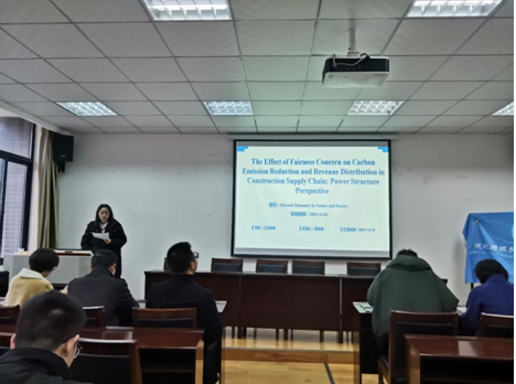 李雨芯以《高质量发展理念下成渝城市群社会经济与生态环境耦合协调测度及时空特征研究》为题进行汇报,该文评估了高质量发展背景下社会经济的发展与生态环境两个系统间的耦合协调度,从时间和空间的角度分析了其耦合协调度的变化规律与特征;彭荣存以《城镇化与生态环境耦合协调发展与空间分异研究——以中国雅安市为例》为题进行汇报,该文针对雅安市如何在加快城镇化进程的同时,实现城镇化与生态环境协调发展展开研究;刘梦林以《柔性限额与交易下考虑不同权利结构的装配式建筑定价与协调研究》为题进行汇报,该文利用博弈论对具有柔性限额与交易和不同权力结构的装配式建筑供应链进行决策,设计了二部制定价合同协调供应链,提高供应链绩效;蒲林青以《不同权利结构下公平关切对建筑供应链碳减排和收益分配的影响》为题进行汇报,该文研究了一个由总承包商和分包商组成的两级建筑供应链,考虑公平关切和限额交易的建筑供应链减排和利润分配策略,分析了限额交易和公平关切对建筑供应链最优决策和最大利润的影响;孙梓铖以《建筑窗户及遮阳系统参数多目标优化设计:考虑能耗、光环境、舒适度和隔声效果》为题进行汇报,该文利用非支配排序遗传算法NSGA-II和EnergyPlus能源仿真软件,提出了考虑建筑能耗、室内光环境和室内热舒适度的多目标优化模型。