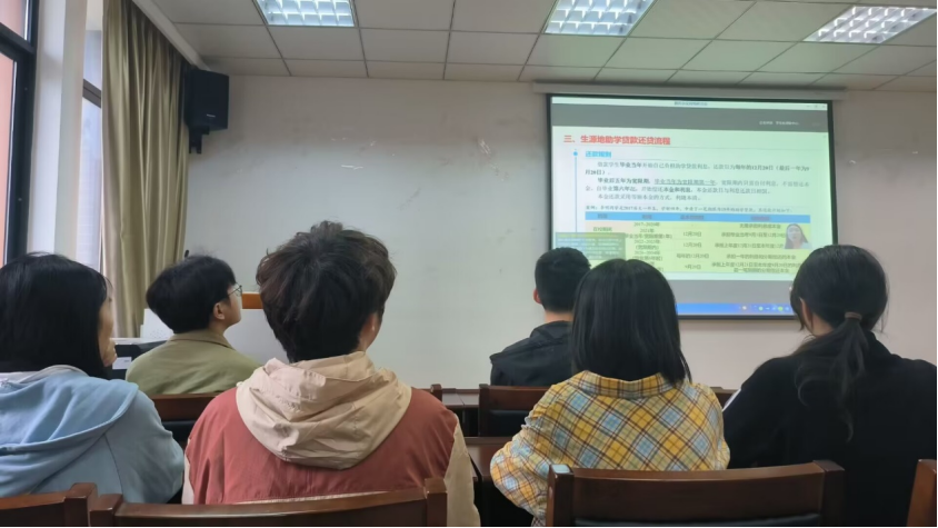 会议开始,由杨丽娟老师先为办理过助学贷款的毕业生同学解读生源地助学贷款信贷政策,讲解了生源地助学贷款本金延期的具体流程以及生源地助学贷款的还贷流程,最后向毕业生同学提供了答疑的咨询渠道。