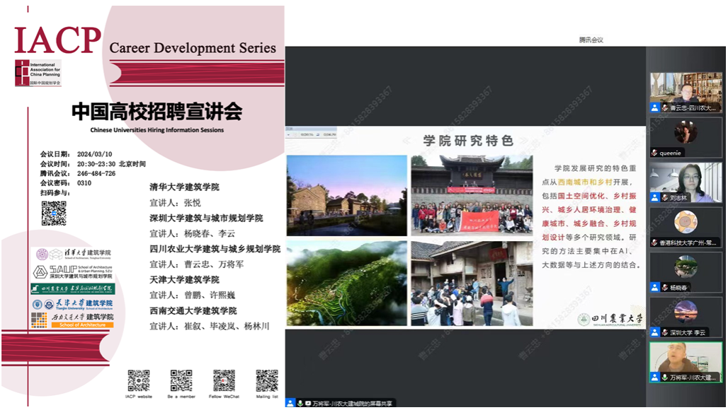院长曹云忠教授、城乡规划系万将军副教授在线参加了国际城市规划学会(IACP)组织的中国高校招聘宣讲会。国际城市规划学会致力于搭建连接中国和其他国家规划研究者和从业者之间的桥梁,以及提供开展规划学术及职业交流和讨论的平台。本次参与招聘的高校有清华大学建筑看球直播app