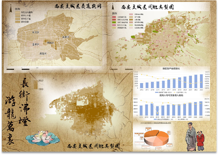 其中,陈曹鑫、蓝晨霖团队的遥感分析作品《基于MapGIS遥感平台的宜宾市主城区土地利用演变及城市扩张分析》利用遥感分析原理和技术对四川省宜宾市主城区近十年的土地利用的演变规律和城市扩张趋势进行了深入分析,为城市规划和土地管理提供了科学依据;李佳昕、王诗怡团队的矢量制图作品《长安故里》,以长安古城为背景,运用GIS技术细致解读了古城的历史演变与文化遗产,展现了古城的历史风貌与文化价值;王诗怡、李佳昕、彭柏彤、龚艾媛团队的制图作品《刺桐古韵,海丝新章--东亚文化之都·泉州地图纪行》以海上丝绸之路泉州作为切入点,通过SuperMap软件制图,对泉州的历史文化和现代发展进行了全面展示,呈现了一幅幅生动的泉州地图。