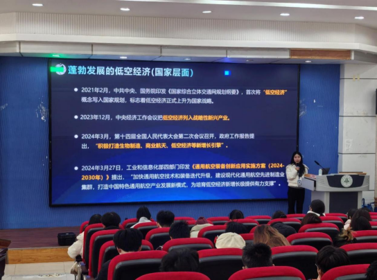 刘利红老师从国家战略角度阐述了无人机低空经济的重要性,指出这一战略性新兴产业涵盖制造、飞行、保障及服务等领域,已形成完整产业链,有望成为经济增长新引擎。她重点介绍了无人机在航拍、工程、城市管理、文物保护等方面的应用,通过案例展示让同学们了解其发展前景,并鼓励同学们积极关注这一领域的发展动态,抓住时代机遇。
