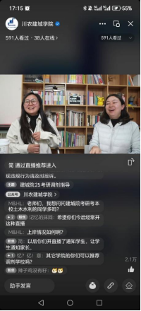 官方微信账号在直播间首次开启主题为“25届考研调剂指导”的直播,吸引了大量学生与家长的关注。此次直播由院党委办老师车亮亮以及具有多年考研调剂经验的张老师联合主播,旨在为25届考研调剂的同学提供全方位的指导。
