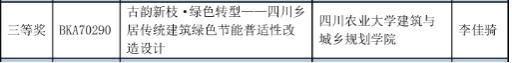图为闫亮老师、张丽丽老师、魏沂轩老师指导的三等奖作品《古韵新枝·绿色转型——四川乡居传统建筑绿色节能普适性改造设计》