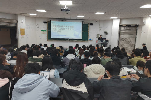 随后,郎云飞作了题为《AI赋能下的数字造价创新实践》的报告。郎总监从技术演进角度出发,深入讲解了数字造价产品的研发历程和AI技术在造价管理中的创新应用,向新生展示智能化工具体系在提高造价工作效率、优化成本控制、促进项目精细化管理等方面的实际成效,为同学们展现了新时代工程造价岗位的技术新格局与发展新前景。