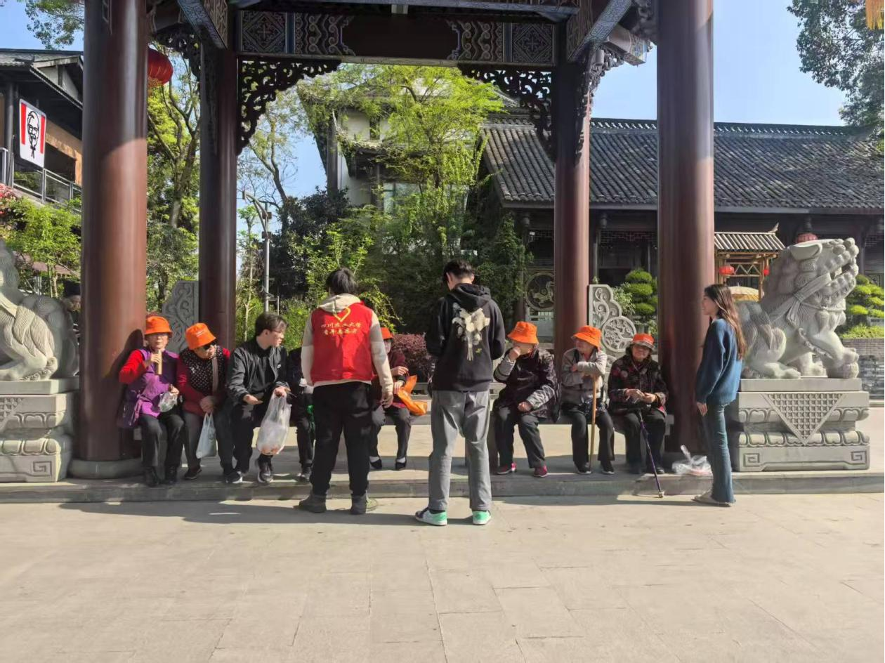 在青城山入口前的开阔处,老人们与学生们围坐一圈。春日暖阳下,大家一边分享清甜水果,一边倾听“00后”志愿者讲述现代农业里的绿色技术,从无人机精准施肥到智能滴灌节水系统。83岁的王爷爷感慨:“这次出游,既让我好好感受了春天,又学到新知识,心里比这春光还敞亮!”