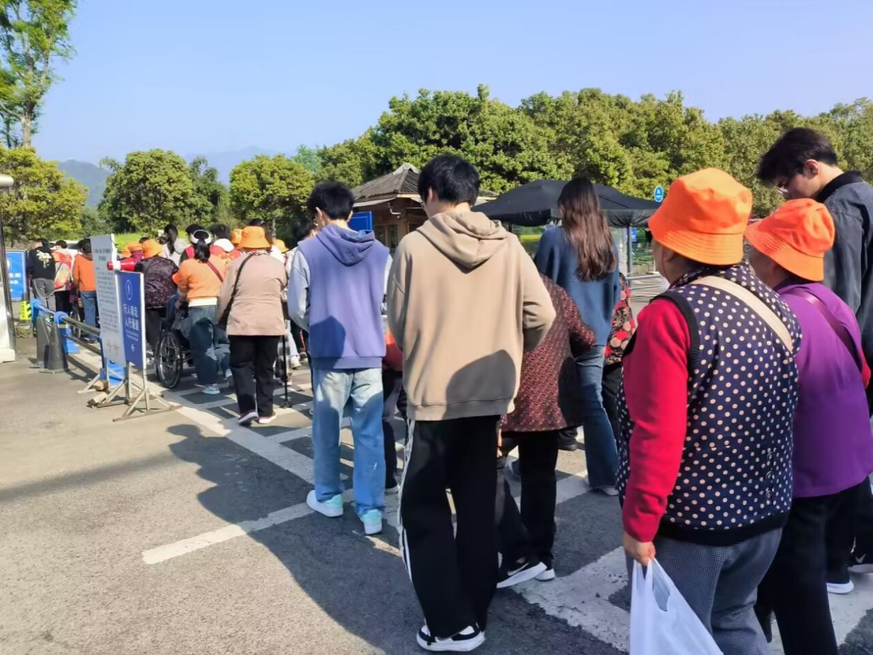 抵达青城山景区,石板路蜿蜒向前。志愿者们或小心推着轮椅,或轻轻搀扶老人,脚步缓而稳。他们随身携带可降解垃圾袋,在游玩中细致提醒垃圾分类回收,让环保理念如春风化雨,融入每一处细节。