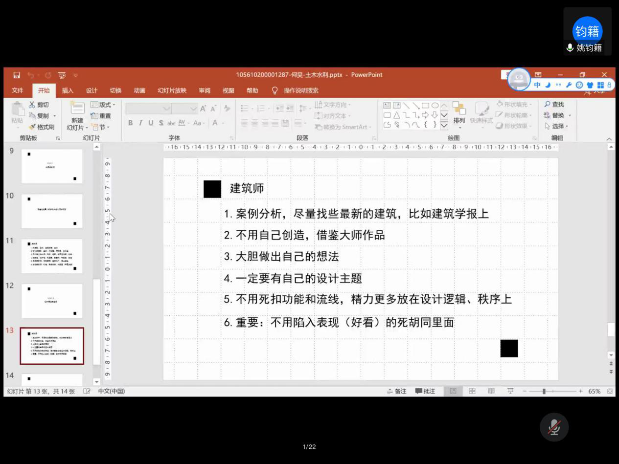 学生会主席的孙思佳也从自己在学生会中的工作、竞赛经历以及学习方法上介绍了自己大学五年的各方面经验,她提出,学建筑是不可否认的累,但是平时也要保持一个积极向上的态度以及一颗平常心,还着重强调了拥有好的心态的重要性。两位前辈还不约而同地提到博览群书的重要性,姚均籍提出建筑师自身的竞争力很大程度上来源于他读过的书的数量,孙思佳也提出既要把书读厚,还要把书读薄,即既要多读书,还要把自己读过的书尽可能地消化掉。两位前辈介绍完自己的学习经验后又分别分享了自己的学习干货,可谓是倾囊相助。