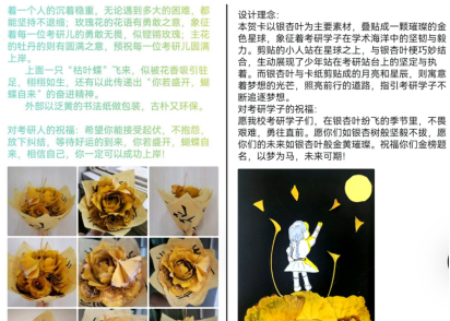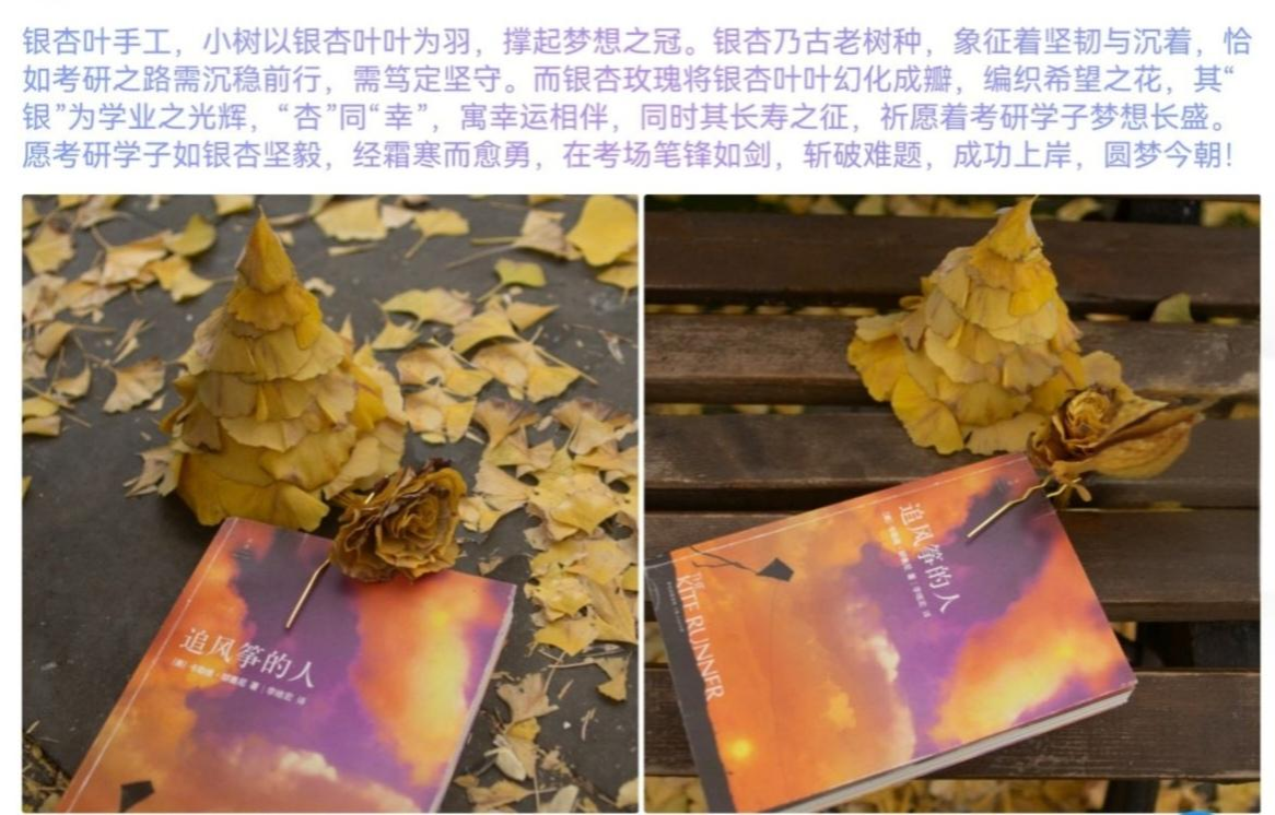 考研学子的鼓励和支持。许多考研的师兄师姐在看到这些颇具心意的银杏手工作品后,都深受感动。